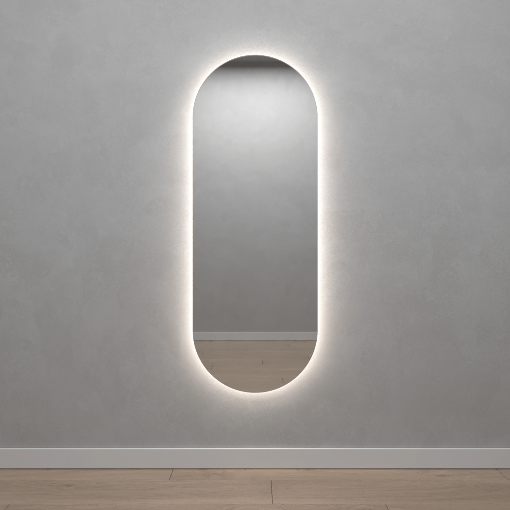 Безрамное зеркало овальной (капсульной) формы с контурной (тыльной) нейтральной подсветкой, свет 4000К. Подложка из высококачественного МДФ, светодиодная лента защищена матовым свето-рассеивателем от попадания пыли и влаги. Есть вывод 220W для подключения к сети, включение подсветки от выключателя на стене, либо от розетки.